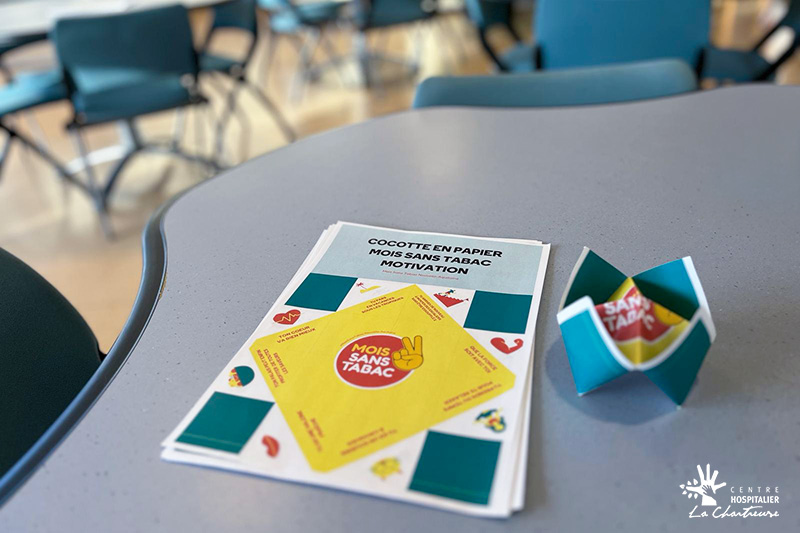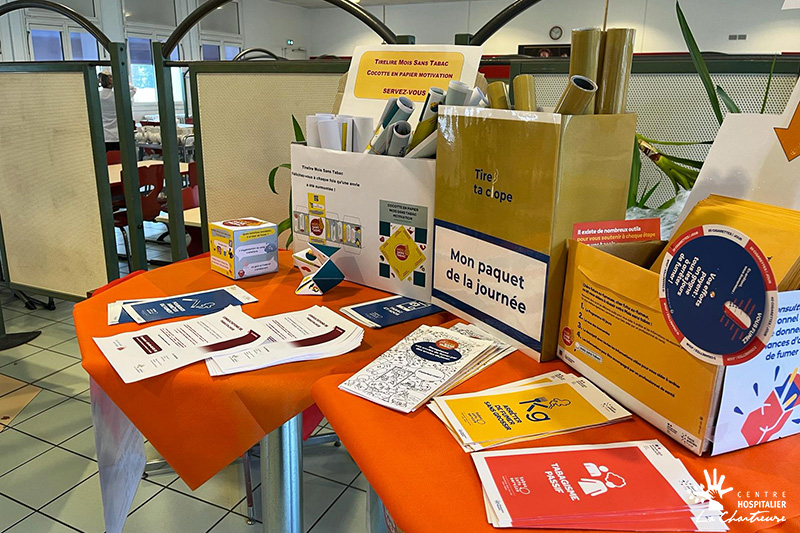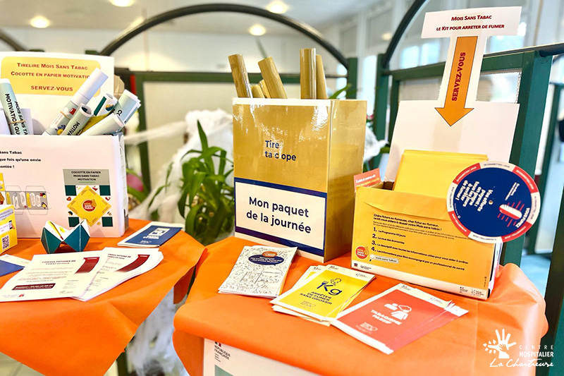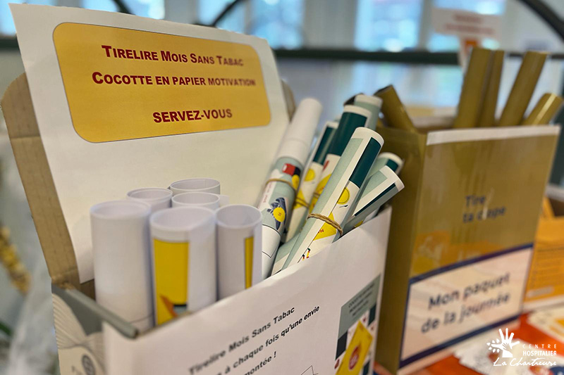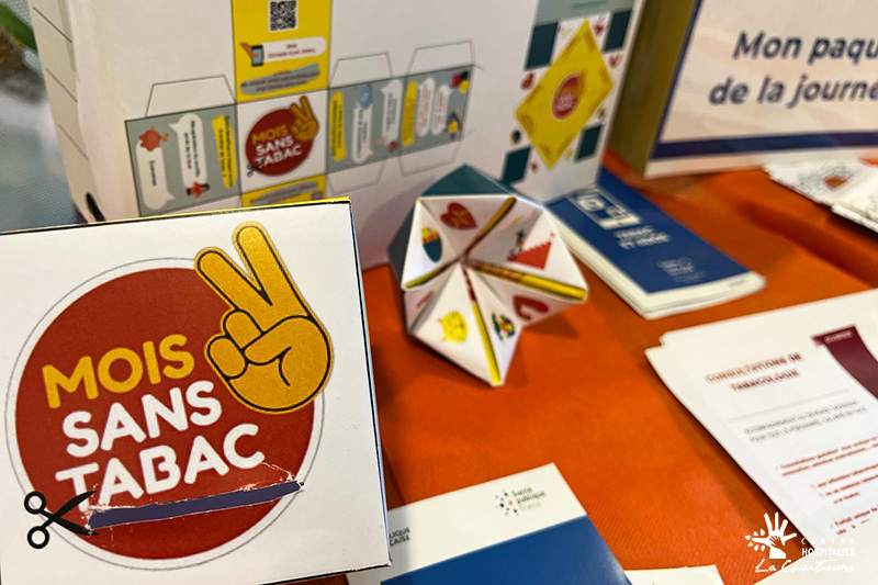 Réalisation d’une cocotte et d’une tirelire du Mois Sans Tabac, affichage thématique, numéros utiles sur chevalet et kits en libre-service.