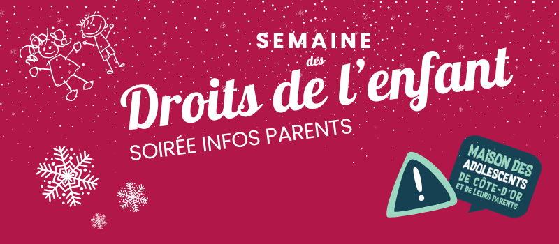 En raison de l’alerte météo ORANGE (Neige / Verglas) émise ce jour, la Maison des Adolescents de Côte-d’Or et de leurs Parents (MDAP21) se voit contrainte de reporter les 4 soirées débats initialement prévues ce jeudi 21 novembre 2024 dans le cadre de la Semaine des droits de l’enfant.